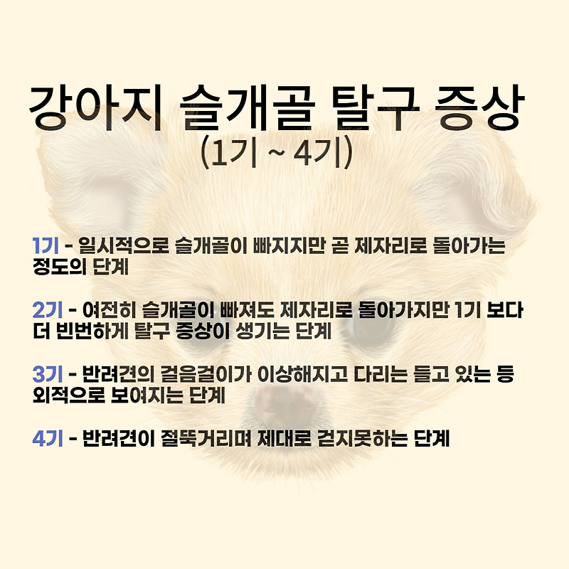 슬개골 탈구 1~2기의 경우 슬개골이 탈구, 들어가기를 반복하여 가벼운 증상을 보이지만 -3~4기의 경우 완전히 탈구되어 통증을 느끼거나 십자인대 파열 등 심각한 관절질환을 초래할 수 있습니다.