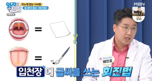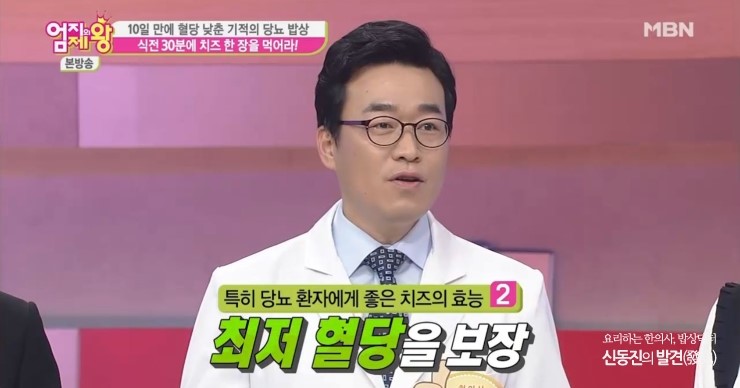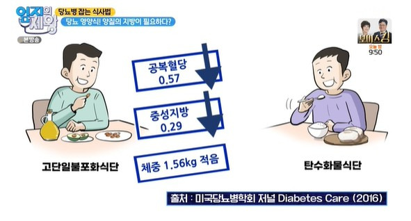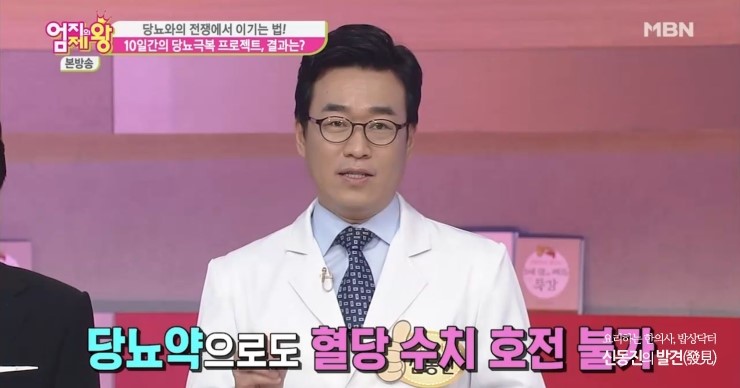당뇨병 식단으로 탄수화물 대신 살코기 위주로 섭취하는 것을 권장하지만 육류에서 베이컨은 제외한다.탄수화물은 없지만 나트륨 포화지방 칼로리가 높기 때문에 베이컨을 녹색 칸에서 빨간색 칸으로 옮긴다당지수는 2006년 시드니대에서 제안한 개념이지만 한국인에게 맞게 재설계한 엄지의 제왕 당뇨 피라미드를 요약하면 당뇨식단안전식품(녹색 송어)에 고기 고등어 토마토 통밀빵 등 주요 식품(노란색 송어)으로 부드러운 복숭아 매운 고추 현미 호박 등 위험식품(빨간 송어)으로 고구마 바나나 밀가루 마가린 명란 베이컨 등이 있다.당뇨병에 좋은 음식, 나쁜 음식을 아는 것도 중요하지만 어떻게 먹느냐도 중요하지만 혈당을 억제하는 식단, 피라미드 식탁을 살펴본다.<엄지의 제왕 피라미드 식탁> 1. 반대로 식사법혈당을 억제하는 피라미드 식탁의 첫 번째 아래 위에 먹는 엄지 제왕 피라미드 식단의 핵심은 녹색 칸(안전), 노란 칸(주의), 붉은 칸(위험) 아래 위로 차례로 식사한다.초록깡 안전식품의 특징은 혈당을 천천히 올리는 음식으로 초록깡 식품을 섭취하면 인슐린 반응 속도가 느려져 포만감이 증가하기 때문에 결국 혈당을 높이는 음식 섭취를 줄이게 된다.간단히 말하면 식사 순서를 반대로 채소, 고기, 밥 순으로 먹고 채소와 고기를 조금 남겨 밥과 함께 반찬으로 섭취한다.2) 향초 먹어라당뇨병식 완전정복, 혈당을 억제하는 피라미드식의 두 번째 향초, 향신료와 식초를 먹는 것이다.당뇨병 환자들이 식사를 지키기 어려운 이유는 맛이 없기 때문이지만 다양한 향신료를 활용하여 다양하고 새로운 맛을 즐기는 식초의 경우 그 자체가 혈당관리 개선에 도움이 되고 식후 혈당치에도 도움이 된다<엄지의 제왕 당근 운동> 당뇨병 억제 근육 운동법당뇨병 치료는 식사가 50%, 약물이 20%, 운동이 30%로 대부분의 당뇨병 환자는 감량을 위한 유산소 운동을 하지만 마른 당뇨병은 근육 부족으로 유산소 운동과 근력 운동을 병행해야 한다.엄지의 제왕 당뇨 운동, 혈당을 억제하는 근육을 키우는 당근 운동법 등 2가지 짐볼 스쿼트, 투명 줄넘기 운동을 배운다.(당근운동 – 짐볼 스쿼트)1. 밸런스볼을 이용해 벽에 앉힌다.2) 다리는 어깨너비만큼 벌리고 손은 팔짱을 낀다3) 앉은 자세로 최대한 오래 견디다(무릎 통증에 맞춘 짐볼 스쿼트 운동)상체를 세우기 위해 팔을 앞으로 뻗고 앉은 상태에서 2초간 견딘다.이때 무릎과 엉덩이는 수평으로 유지한다.당뇨병에 좋은 근력운동 ‘스쿼트’ 몸 전체 근육의 약 40%가 허벅지에 집중돼 허벅지가 굵을수록 당뇨병을 막을 수 있다.(당근운동-투명줄넘기)1. 양손목을 흔들며 제자리걸음을 한다.2. 관절에 무리가 가지 않도록 가볍게 달리기(엄지 제왕 투명 줄넘기 팁) 발목이나 관절이 좋지 않을 경우 매트를 깔거나 운동화 착용을 권장한다.엄지 제왕 당뇨 운동은 허벅지 운동과 전신 유산소 운동인데 혈당이 높을 경우 30분 이내에 조금 숨이 차고 땀이 날 정도로 운동한다.