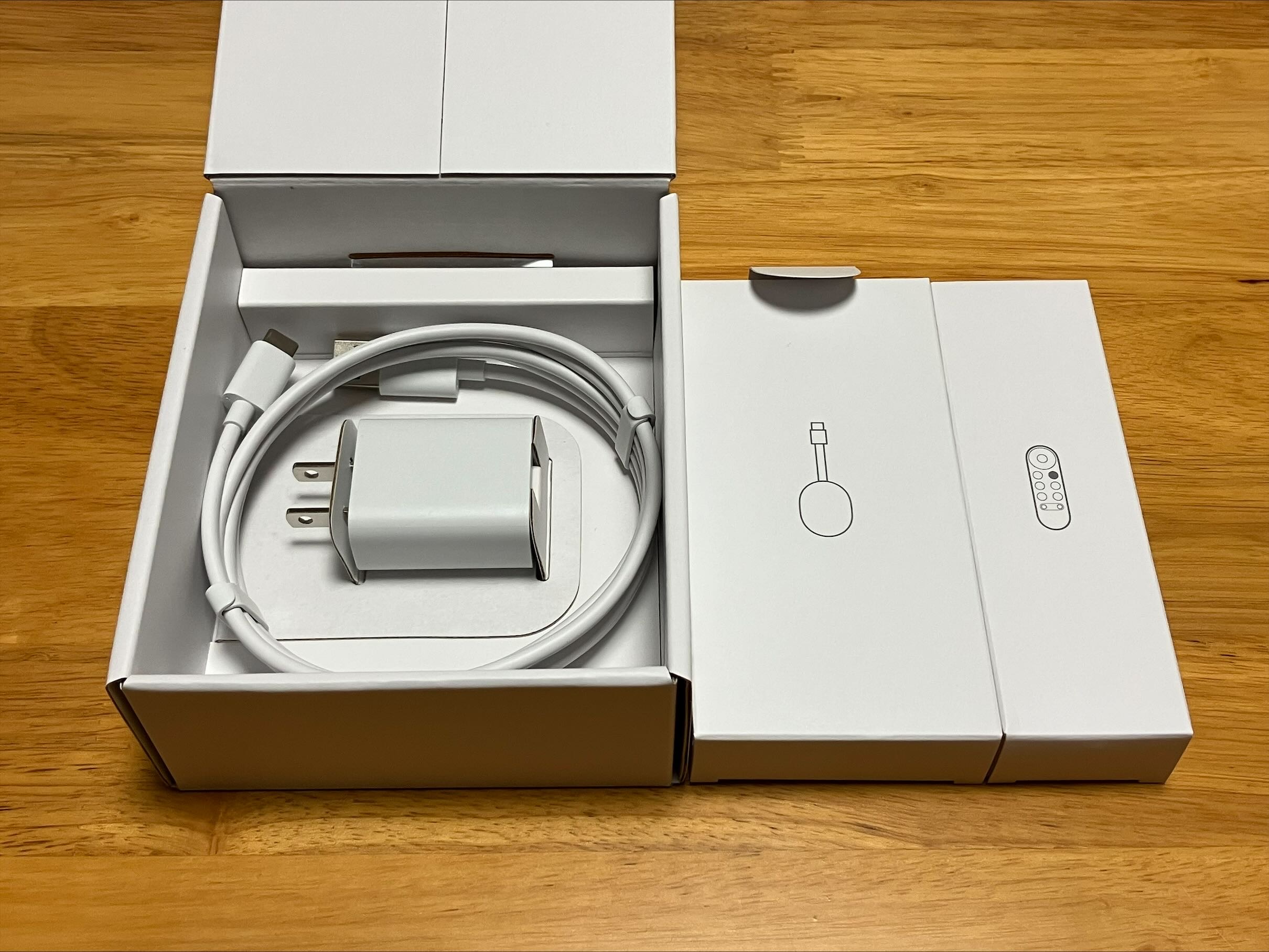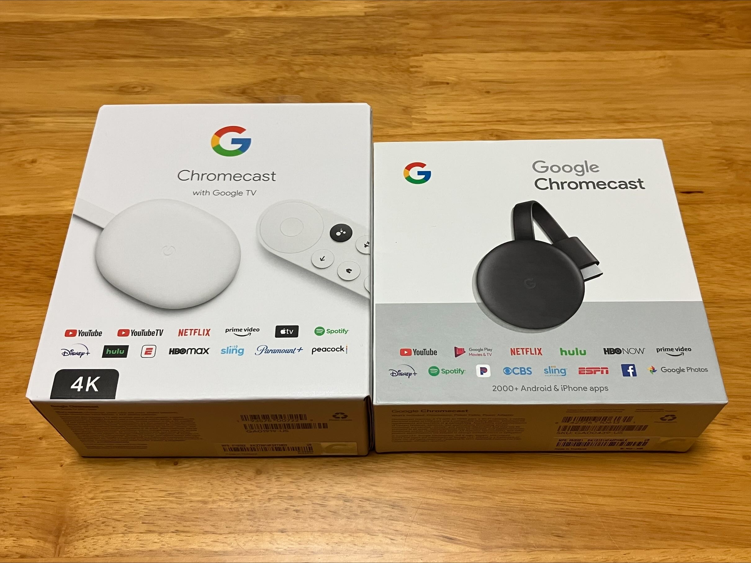 크롬캐스트 삼세대와 함께 나무 상자 크기 비교. 넓은 길이와 키 같지만 길이 길이 삼세대 상자에 처럼 약간의 더 거리모두.